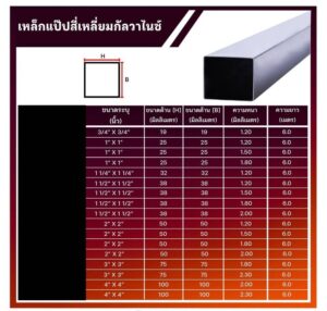 เหล็กกล่องเหลี่ยมกัลวาไนซ์มีตั้งแต่ขนาด : 3/4″x3/4″ , 1″x1″ , 1-1/4″x1-1/4″ , 1-1/2″x1-1/2″ , 2″x2″ , 3″x3″ , 4″x4″, 5″x5″
